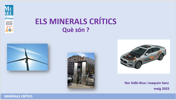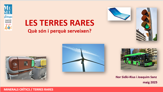 Venid al Museo de Geología Valentí Masachs y podréis saber qué son los Minerales Críticos y qué son las Tierras Raras (de los que tanto se comenta en los medios de comunicación) y podréis verlos físicamente en las vitrinas y cuales son sus aplicaciones. Además, una gran pantalla de TV os mostrará detalles de donde se utilizan, tanto en automoción como en diferentes elementos de nuestra sociedad en la vida cotidiana.
